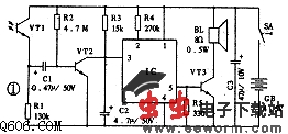 光控语音警示电原理图如图1。整个电路由光控电子开关和3秒语音集成电路两部分组成。图1中光敏三极管VT1和晶体三极管VT2,电阻R1、R2、R3和电容C1、C2等构成光控开关电路。语音集成电路IC及三极管VT3、电阻R4、R5裙钩捎镆舴糯蟮缏贰M?是该电路的印刷电路板图。平常在光源照射下,VT1呈低阻状态,VT2饱和导通,IC的触发端③脚得不到正触发脉冲而不工作,扬声器无声。当VT1被物体遮挡时,便产生一负脉冲电压,并通过C1耦合到VT2的基极,导致VT2进入截止状态,IC获得一正触发脉冲而工作,输出音频信号通过VT3放大,推动扬声器发出声响。声响内容可根据不同场合选择不同的语音电路来产生,例如高压电网或配电房等场所,可选用“高压重地,禁止入内”、“有电危险,请勿靠近”等语音集成电路。