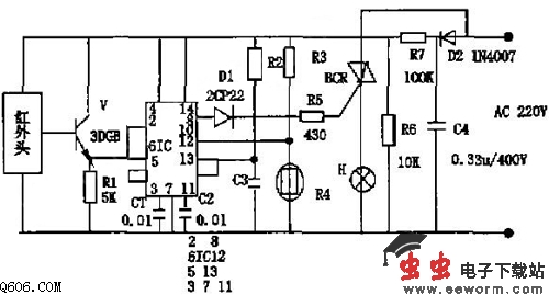 如图为灯控器的完整电路。220V交流电压经D2半波整流,c4滤波,R6、R7分压后给开关电路供电。R3、R4组成光控电路。白天,R4(光敏电阻)呈低阻,Ic控制端为低电乎,其输出端始终为低电乎,双向晶闸管BCR截止。晚上,R4呈高阻,Ic控制端为高电平,当红外接收头检测到人体辐射出的红外线时,Ic输出高电平,双向晶闸管BCR导通,灯H被点亮 定时到后,Ic输出低电平.BCR截止。当人一直在红外接收头检测范围内活动时,灯可连续点亮,这点它优于声控器 另外,它无误动作,不像声控只要有响声就点亮,此时可能并不须要点亮。