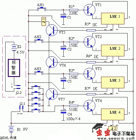 工作原理:该装置的电路工作原理如图。该密码电子开关设计了三个开锁按钮,并在限时电路、误码锁和电子报警电路。只有正确地按动开锁按钮AN1、AN2、AN3才能使继电器J1励磁吸合,其吸合时间由R1、C1数值确定。从图中可以看出,三极管VT5、VT6、VT7串接成与门逻辑电路,这三只三极管中的任何一只截止,均会引起继电器J1的释放。AN1-AN8这5只按钮并接成或门逻辑电路,按下其中的任何一只按钮,均会导致三极管VT4的导通,于是LSE的①、②脚串通,其④脚输出高电平,继电器J2励磁吸合。J2吸合后,常闭触点j2-1断开,切断了开锁电路的电源,此时无论怎样摆弄AN1、AN2、AN3均无效,其封锁时间由R4和C4的数值确定。与此同时,J2的常开触点j2-2闭合,接通了报警器的电源,发出报警音。
