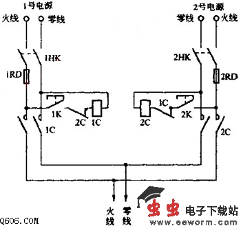 如图所示是单相照明双路互备自投供电线路,当一号电源无故停电时,备用电源能自动投入。图中1K、2K为小型开关,1C、2C为交流接触器。工作时,先合上开关1K,交流接触器1C吸合,由1号电源供电。然后合上开关2K,因1以、2C互锁,此时,2C不会吸合,2号电源处于备用状态。如果1号电源因故断电,交流接触器1C释放,其常闭触头闭合,接通2C线圈电路,2C吸合,2号电源投入供电。也可以先合上开关2K,后合上开关1K,使1号电源为备用电源。