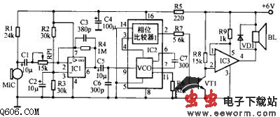 音频信号由IC2锁相环电路的9脚输入,经内部压控振荡器VCO转换成变频方波,再通过内部相位比较器1比较放大后从2脚输出,通过VT1去推动IC3工作,然后由IC3推动扬声器发音。IC2锁相环电路的9脚无信号输入时,2脚输出电平为0V,IC3停止工作。