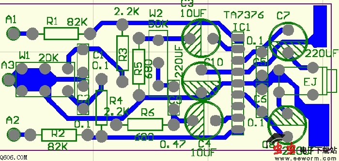 说明:电路原理图中,W1为双联电位器,用于低音增强,W2为调节混响效果。印刷电路板图中,A1,A2为左右声道输入。电位器W1和W2都固定在盒子的边缘,其中W2为带开关的电位器。