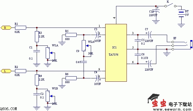 用东芝TA7376P推动头戴式耳机。这种IC内藏两个通道,外接元件少,可在低电压下工作。负载阻抗较低时,可重放出动人效果的低频声音 。