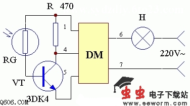 工作原理:该装置应用电路工作原理如图。在白天,由于光照较强,光敏电阻RG的内阻很小,此时有较大电流通过RG而使三极管VT饱和导通,VT饱和后,控制器DM的④端电压远低于1.6V,故DM内部截止,照明灯H不能点亮。