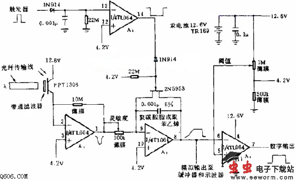本电路中,光敏晶体管和四运算放大器起着总能量检测器的作用,用以检测通过光缆通信系统传输的脉冲式光信号的总能量。如果信号源的光强度保持不变,那么,这个电路可以用来检查和比较长的光纤的状况,也可用来检测光强度的变化和脉冲宽度的变化。如果最小脉宽为10(μs,则在1×10-5~10×10-5J/cm的范围内,本电路对光强度的响应是线性的。A2起着RC积分器的作用,其输出电压与接收到的总光能成正比。A4用来与固定电平做比较。
