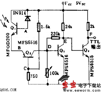本电路利用光敏晶体管驱动三只晶体管放大器,产生TTL输出,数据率可达20千位/秒。