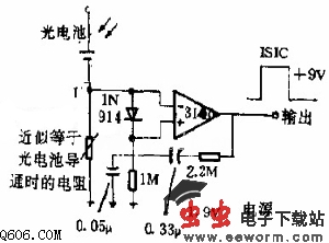 如图所示。 3140运算放大器只对照射到光电池上的光的突然变化作出反应,而忽略掉环境光线的缓慢变化。当光束突然断开时,运算放大器在延迟时间之内保持正输出。该延迟时间取决于正输入端0.05μF电容器的充电过程。延迟排除了杂散信号的影响,直到光电池将其本身复位到正常照明为止。图中所示的数值可得到1s的时间延迟,输出信号为矩形波。