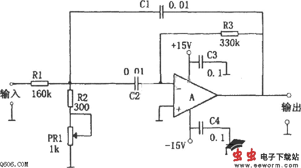 下图所示是一用单只运放组成的单峰特性滤波电路。该电路用一只运放及少许元件构成滤波器,可以获得与LC元件构成的具有同样特性的滤波器电路,在不改变电路增益的情况下,可方便调整谐振频率。本电路用电位器PR1来调整谐振频率。PR1值从最小调到最大时,谐振频率调整范围为
