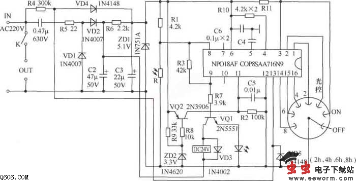 如图所示为一款墨西哥光控定时开关电路,特别适用于户外路灯及广告灯箱供电控制,它是一款将光控功能和调挡定时合二为一的产品,该装置电路简单,容易制作。将旋转开关掷于2h、4h、6h或8h的定时挡位,无光照时本电路将自动控制给出的对应时间,可达到节电及减少无效耗能的目的。