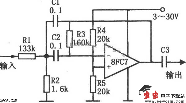 如图所示为单电源低电压带通滤波电路。该电路采用单电源运算放大器8FC7构成二阶带通滤波器,电源电压范围可从3V到30V。在决定各元件数值时,首先确定带通滤波器的中心频率f0,再按下表选用合适的电容C(C=C1=C2)。然后选定Q值。Q值是代表选频特性的一个参量,Q值高,通带就窄。当Q=10时,可得每倍频程-40dB的频率响应特性。但Q值太大,电路稳定性差。一般Q值选择小于10。闭环增益K,应保证在不失真前提下得到尽可能大的输出幅度。一般KF小于l。最后由以下三式计算出R1、R2、R3。