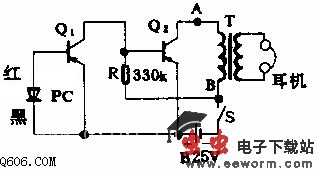 如图所示, 本电路采用一个IR-B2M型的光电池接收光信号。光信号可以是可见光或红外光,以发光二极管或半导体激光器作光源时,调制频率以(0.5~2.0)kHz为佳。当光照射光电池时,产生的交变电压通过Q1、Q2放大,再经过一个与耳机阻抗相匹配的输出变压器,就可以用耳机清楚地听到声音。