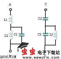 元件L2与C1为并联谐振,产生陷波频率。元件L1与L2与C1并联谐振,产生通频频率。也就是,对低频阻隔,使高频通过。(因L1与L2并联电感值变低,谐振频率变高。)