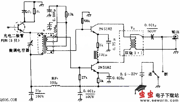 如图中所示,光电二极管列陈同通信系统的发光二极管照射,将光信息转换到广播频段上去。电路与1:1平衡与不平衡转换器相似,具有单通路输入,两通路输出,两输出之间相移90度。电路不需要中和,合理地给出高的增益,且具有低的噪声响应。