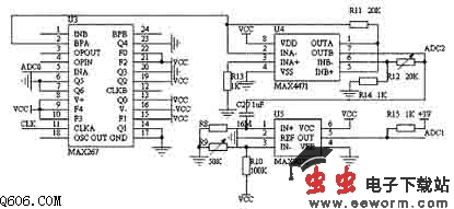 如下图所示,电路由滤波和放大两部分组成。其中MAX267是MAXIM公司出产的一个集成滤波器,可以构成低通、带通、高通、等多种方式,使用灵活,性能远远优于采用集成运放组成的滤波电路。