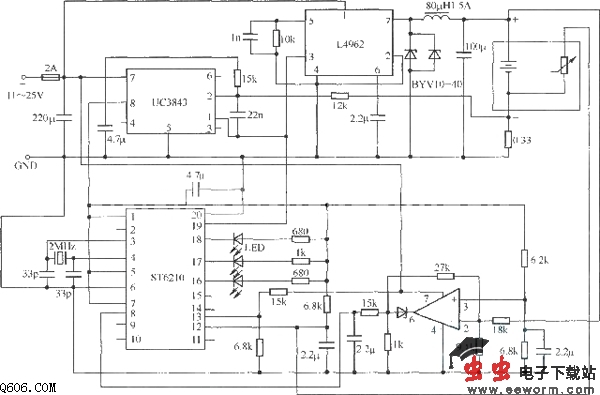 ST6210可通过把3种充电终止方法相结合来达到安全充电的目的。由ST6210构成的电池充电器电路如下图所示。