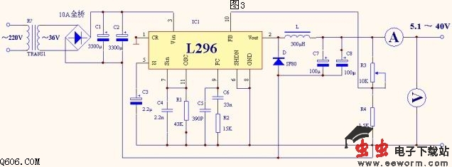 下面是输出5.1~40V 4A直流可调稳压电源的电路图,由于没有复位输出,所以12、13、14脚悬空,过压保护没有使用,所以15脚悬空,1脚接地,大家可以看到电路非常简洁,容易制作。