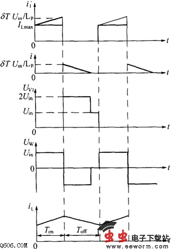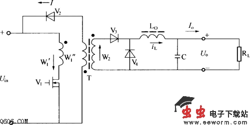 如图所示,当开关管V1导通时,输入电压Uin全部加到变换器初级线圈W1'两端,去磁线圈W1''上产生的感应电压使二极管V2截止,而次级线圈W2上感应的电压使V3导通,并将输入电流的能量传送给电感Lo和电容C及负载;与此同时在变压器中建立起磁化电流,当V1截止时,V3截止,Lo上的电压极性反转并通过续流二极管 V4继续向负载供电,变压器中的磁化电流则通过W1''、V2向输入电源Uin释放而去磁;W1''具有钳位作用,其上的电压等于输入电压Uin,在V1再次导通之前,T中的去磁电流必须释放到零,即T中的磁通必须复位,否则,变压器T将发生饱和导至V1损坏。通常W1'=W1'',采用双线并绕耦合方式的占空比<0.5,否则T将饱和。单端正激式变换器波形如下图所示。