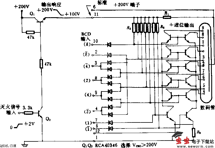 在多数字显示器中,为了强调某些数字,给此电路外加一个熄灭信号以使数码管亮或变暗。其原理是用Q1,Q2把数码管阴极电压从正常值200V降到100V,使数码管变暗。控制信号由Q2的基极输入。当灭火信号为0V时,Q2截止,数码管的阴极电压为200V。当灭火信号为2V时,Q2导通,阴极电压降到100V