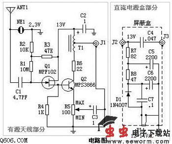 图中虚线框内的电路装在屏蔽盒里,它们是天线放大器的幻象供电电路.J1输出的射频信号通过一端同轴电缆送到J2,再经C4耦合到接在J3的接收机.加在J2的13V直流电源电压则通过同一段同轴电缆和J1为天线放大器供电,C4隔断此直流电压使其不能进入接收机天线输入电路.小型墙上电源变压器次级输出的12-14V交流电压加到插座PL1,经[!--empirenews.page--]二极管D1半波整流和R7,R8,C5,C6滤波后得到13V直流电源电压.C7起旁路作用.