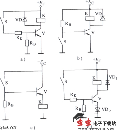如图所示。图a为NPN型晶体管利用+Ec电源控制的电子继电器。 图b为NPN型晶体管接地控制电路。 图c为PNP型晶体管利用-Ec控制的电子继电器。 图d是有自生偏压的电子继电器。