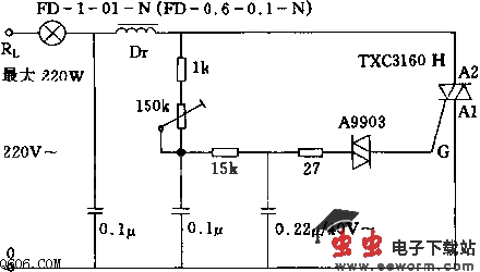 该电路用于200W以下灯的调光亮度,输出电压自8至218V连续无级调节。更换额定电流值更大的晶闸管和双向触发管可带功率更高(如1kW~2kW)的照明灯。