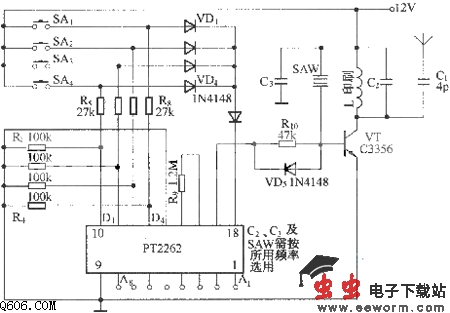 SB-100是一种普及型遥控组件,遥控发射组件的型号为SB-100ATX,接收组件的型号为 SB-100ARX。SB-100ATX组件是一种由SAW元件组成的高稳定度无线电遥控发射电路,它的电路组成与CS900基本相同。电路内包括由超高频三极管C3356与SAW元件组成的载频振荡发射电路和以数字编码电路PT2262组成的发射编码电路,如图所示。SB-100ATX发射组件具有频率稳定度高、发射功率大、适应能力强的特点,发射频率在256~433MHz范围内选择。该电路采用小型贴片式元件,外形尺寸为65×38×15(mm),工作电压12V,采用四路数字编码,设有四个发射按键。