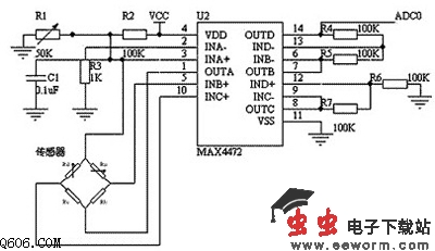 是MAXIM公司的一款集成了四个运算放大器的低功耗放大芯片。本系统中内部集成运放A接恒流源,为压力传感器提供恒定的电流,运放B和运放C,运放D组成差分输入、单端输出放大电路,直接输入ADC0监视血压直流分量。