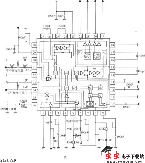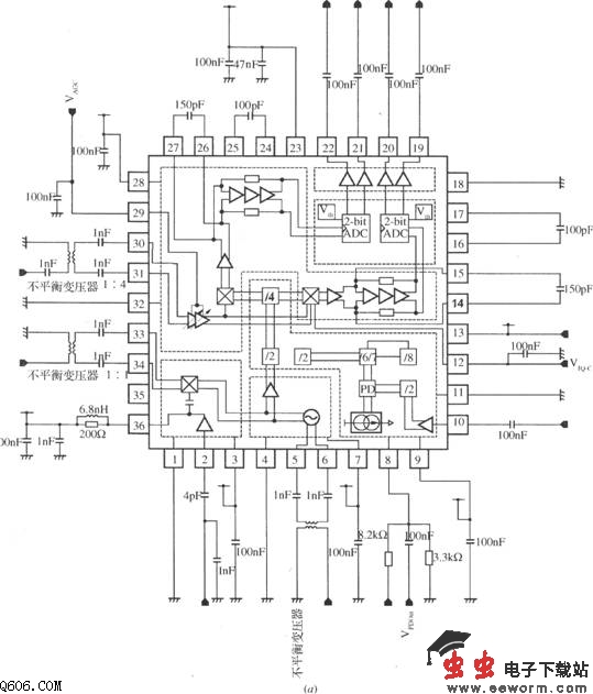 μPB1008K具有IQ恢复功能,在I通道和Q通道分别具有一个2 bit ADC。芯片内部具有固定分频率的前置分频器,VCO分频率为102(8、12.75串联前置分频器),基准分频率为2。通过增益控制引脚可以调节增益,电压上升增益下降。电源电压Vcc=2.7V~3.3V,工作电流消耗为Icc=18.0mA,低功耗模式Icc(PD)=10uA。芯片采用QFN-36封装。