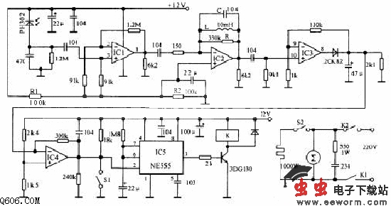 在手置于干手器下部时,由于手对红外线的反射作用,接收电路中的PH302将接收到的红外线变成电信号,经IC1、IC2、IC3组成的选频放大器,其输出信号经放大、整形、滤波变成直流信号进人比较器IC4。比较器的门限电压为7V,设置较高,其目的是提高电路的抗干扰能力。当IC4的输人电平超过7V时,其输出变为低电平,触发IC5定时器开始定时,同时该定时器的3脚变为高电平,使3DG130导通,继电器触点吸合,接通电阻丝和风机。在定时器的2脚设置了手动开关S1,可进行手动操作,还可通过S2选择冷风或热风。