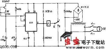 市电通过变压器降压、桥式整流、滤波后取得12V电压供电路工作。555连成单稳定时电路,用3DJ6F接成恒流源给定时电容器C充电,555输出接继电器J1线包实现开关控制。开始,先按一下开关AN启动定时,于是555输出高电平,定时开始。如果这时K在“1”位置,为J1处于定时释放状态,K在“2”位置为定时吸动状态。定时开始后,3DJ6F恒流向C充电,直到C上电压上升达到8V时定时结束,C通过555第7脚放电,555输出变成低电平使J2改变状态。CZ插座就可以获得定时得电(K接“2”)或定时停电(K接“1”)控制。