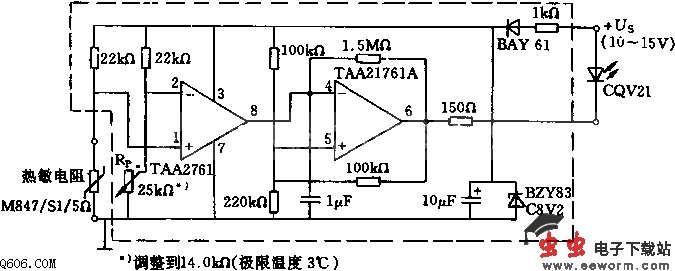 该电路由比较器和单稳多谐振荡器组成,利用热敏电阻测量温度。如果被测温度超过电位器Rp调定的温度,则经由第一个运算放大器构成的比较器输出(脚8)为低电平。如果超过监控温度,则比较器输出呈高电阻性(集电极开路电),于是由第二个运算放大器构成的单稳多谐振荡器工作,发光二极管CQV21闪光。