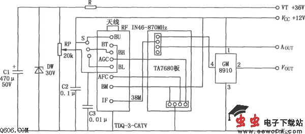 解密接收机由TDQ-3高频头、成品TA7680中放板、解密模块组成,如下图所示。接收机接收到发射信号,在高频头内进行变频后输出38MHz的中频信号,解调后输出音频信号和加密视频信号,再经过8910解密模块后得到视频信号进行监视收看。