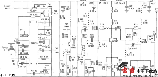 上图所示是发射功率为1W的加密电视发射机电路。其输入信号为音视频信号,发射频道由调制电路中的SW声表面波谐振器决定。由摄像机,录像机、VCD等设备送来的视频信号送入发射机中加密模块的③脚,加密后由①脚输出加密视频信号,经TA7673组成的调制电路调制成射频信号后由VT1、VT2电压放大,VT3推动放大、VT4功率放大后,从天线发射出去。由于VTl~VT4采用宽带放大,其带宽为46~870MHz,因此功率放大和天线之间应使用带通滤波器,以阻止带外发射,进行阻抗匹配。