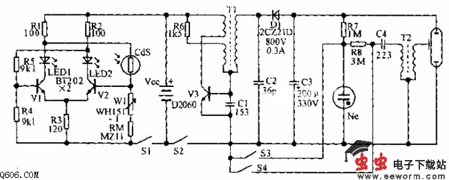 2不发光。此时V1导通,LED1发光。当被摄物的亮度增强时,CdS的阻值减小,此时LED2熄灭,LED2发光,从而提示是否使用