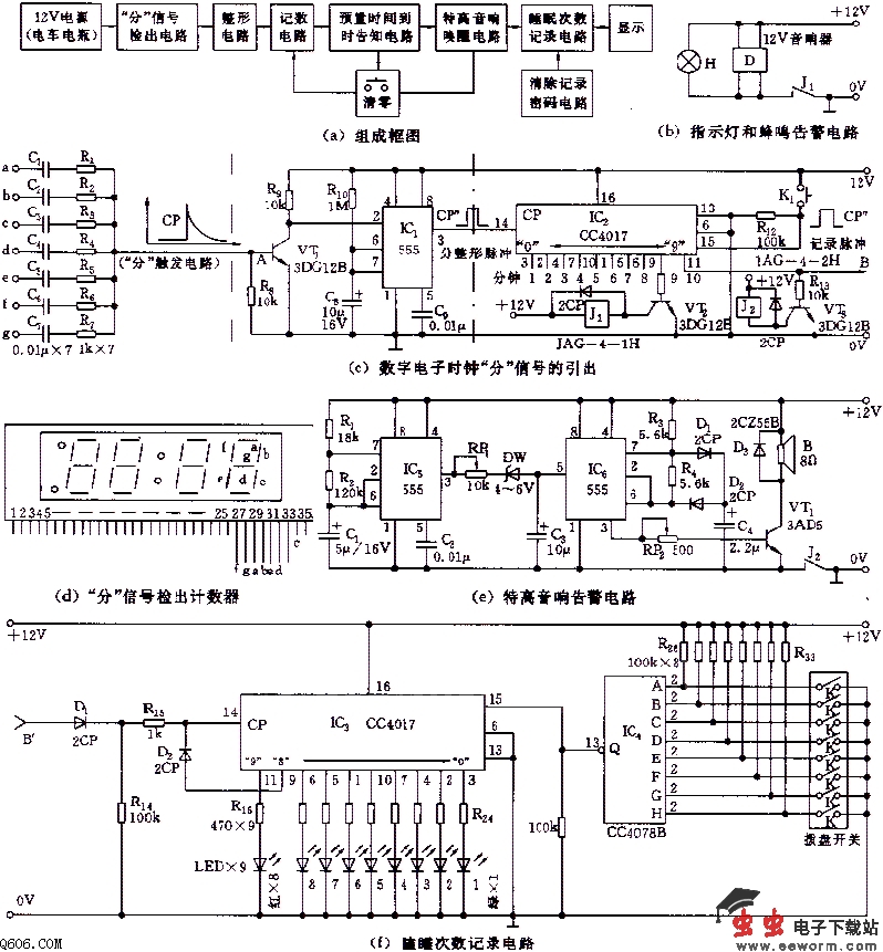 如图所示,本电路主要用于及时提醒打瞌睡者,并能监督、记录值班者打瞌睡的次数。图d为“分”信号检出电路。当LED数字式电子计时时钟的“分”显示字符随着时间变化时,图c的笔划a~g端就会至少有一笔变化。利用检出的“分针”脉冲,由IC2组成一个时间记录和告警电路,对值班人员进行提醒、监督。由于显示“分”的七段(a~g)笔划可能有几段同时变化,故取出的“分”脉冲可能会有几个。由555和R10、C8等组成的单稳态延时电路,要求每分钟只接收一个脉冲,即在定时10秒钟的时间里其余笔划脉冲不起作用。单稳电路的定时宽度由R10和C8时间常数来决定。VT1为倒相放大级,负向脉冲加至触发端2脚,555电路翻转,输出一整形脉冲CP。IC2是一个十进制计数/分配器,最长计时为9分钟。当计到第9个脉冲,即累计计时到9分钟时,9脚呈高电位,VT2导通,继电器吸合,将图b的音响器电源接通,告戒值班员及时按动复位开关K1,使计数电路复位,计时重新开始。若未按压开关K1,1分钟后,即累计到第10分钟时,11脚呈高电位,VT3导通,继电器K2吸合,将图e报警电路的电源接通,断续的尖历报警声将瞌睡值班员唤醒,并及时按下开关K1进行复位。IC2的11脚输出同时还加至图f的IC3的14脚,使该计时电路的3脚呈高电位,LED1发光。如此,若过9个10分钟,则IC3的9脚也呈高电位,LED9发红光,说明值班员已瞌睡达9次之多。注意到9脚通过D2连至IC3的CP端,说明9脚的高电平已将计时电路的CP端封住,不再记录,但LED1~LED9的发光仍会保持,以备查。图f右部为显示清零电路。