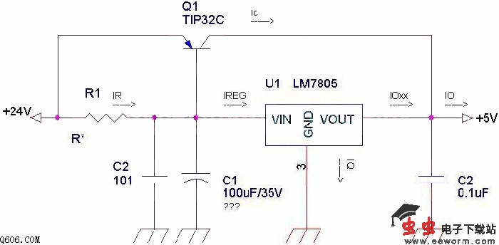 R的大小对调整通过7805的电流有很大的关系,取不同的值带入上式即可看出.R越大,则输出同样的电流的情况下流过7805的电流要小些,反之亦然.通常这样的电路中,对于扩流三极管TIP32加散热片,而对于7805则无需要,但是R的值不能过大,其条件是: R < VBE /( IREG – IB).
