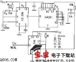 A1起着振荡器的作用,其振荡周期为1/f.振荡器的输出加到A2分频器网络上,输出周期为N/f的信号来触发定时器A3.将A2与A3连接之后,由定时开关SA确定A2的延迟时间(0.5~4h)。如果采用数个分频器(N8281)级联的方式,可把延迟时间延长到几天甚至几个星期。