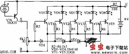 受到光照时,产生的电压使VT6导通。VT6的导通程度和光照强度成正比。VT6的导通电流在R1上产生压降,VT1~VT5基极得到正向电压,但由于信号的大小不同和VD1~VD4的降压作用(0.6V),会使VT1~VT5各基极所得正向电压逐一递减,从而TV1~VT5处于不同的工作状态,所以VD5~VD9有的亮,有的暗,将信号电平的强弱指示出来,也就是把光照的强度指示出来。