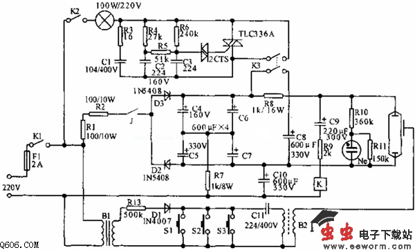;K2为造型灯弱光开关;K3为造型灯强光开关;S1为试闪触发按钮;S2为光控同步闪光