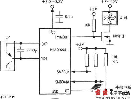 MAX6641的典型应用电路如图所示。在此是用PWMOUT端来驱动N沟道MOSFET,进而控制风扇转速的。远程PN结温度传感器可用微处理器(μP)内部测温三极管的发射结来代替。亦可选用CMPT3906、T3906、KST3906-TF、SMBT3906等型号的分立元件三极管。要求三极管发射结的正向压降必须在最高预期温度和10μA电流下大于0.25V; 在最低预期温度和100μA电流下小于0.95V。不得使用大功率三极管。