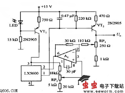 如图是由LX5600构成的温度接口电路。电路中,由LED和VTl构成恒流源电路,为LX5600提供恒定的工作电流。VT2为低输出阻抗的放大器,将LX5600的输出信号进行放大;Al为反相放大器,它完成负反馈工作;RP1用于调节转换灵敏度;RP2用于调零。输出电压为o一5v,温度为100℃。