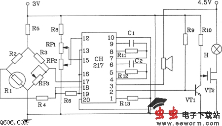 如图所示的是CH217单片瓦斯、煤气检测报警集成电路构成的瓦斯、煤气检测报警电路,图中R1为瓦斯传感探头,其阻值随便瓦斯浓度增加而线性减少,RP3用来调整放大器的输出电,R6、R7提取预报和危险两种基准信号电压。