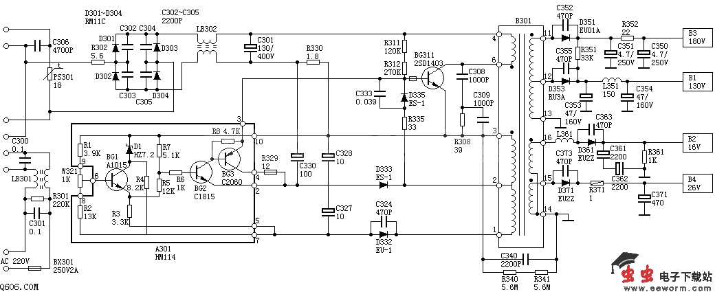 BG311截止期间,D351、D353、D361、D371均导通,B301储存的磁场能量被转化成电能得到释放,从而建立180V、130V、16V、26V四组电压。