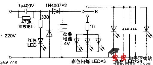 根据实物画出的电路工作原理图如图5所示,220V交流市电经电容降压、二极管整流后给铅酸蓄电池充电,红色LED作充电指示。充好电后使用时闭合按钮开关K,将首先接通3颗彩色闪烁LED,发出梦幻般变化莫测的七彩光芒,在夜间平添一些生活乐趣,再按一下开关K则关闭彩色闪烁LED,接着再按才会接通24颗并联的高亮LED,由于数目较多,照明效果很好。