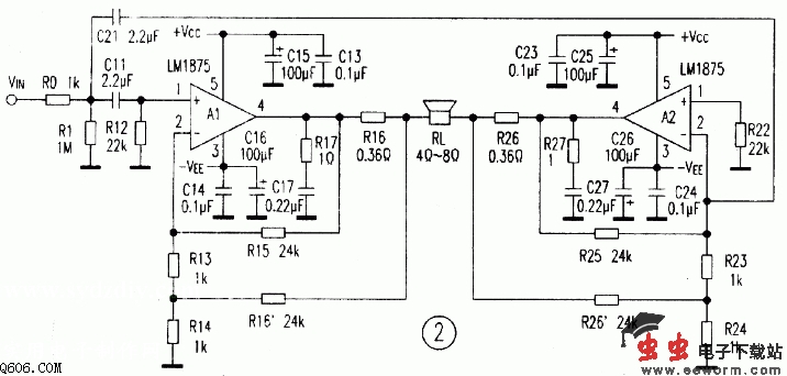 直流化电流负反馈BTL电路见图2,取消标准BTL电路中的C12、C22,使电路直流化;电阻R16与R26是取样电阻,电流反馈信号经R15、R16、R25、R26分别进入放大器A1、A2的反相输入端,R13、R14、R15、R16的阻值决定放大器增益的大小。