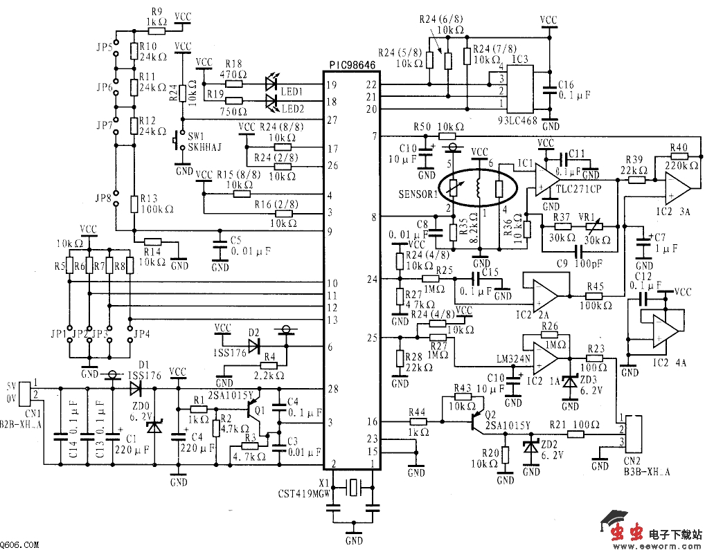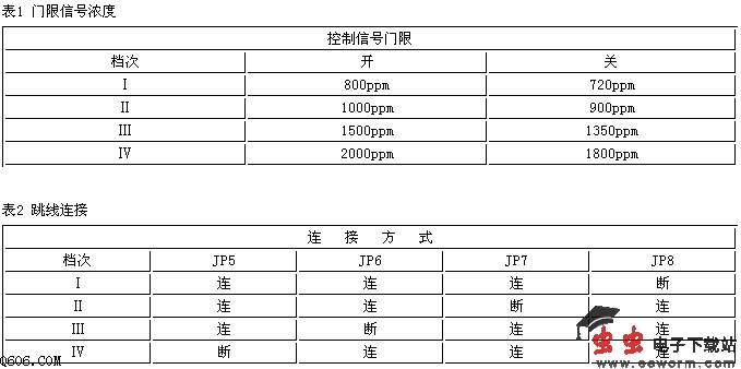 利用TGS4160传感器并通过高输入阻抗、低偏置电流的运放进行放大,再作一些简单的运算处理,就可以在CO2浓度为300~5000ppm的范围内测得信号,该信号为0~几百毫伏的电压信号,可以供高精度A/D采样使用。如果使用费加罗(FIGARO)公司提供的AM-4 CO2传感器模块,则可直接应用于自动通风换气系统或是CO2气体监测。该模块内部带有A/D转换器,并已对数据进行了采样并作了处理。它输出的电压信号与CO2浓度值呈线性关系,输出的电压信号为0~3.0V,相当于0~3000ppm的CO2浓度。另外,该模块还提供有中继转接控制信号。当CO2浓度高于设定值时,输出的转接控制信号为高电平5V,该信号可以使得红LED点亮;反之,它将转接控制信号为低电平0V以使绿LED点亮。但是,该模块的设定值是分档的,而不是连续可调的。共分为四档(可通过线路板上的跳线来实现),表1和表2分别给出了门限开关信号的浓度值及跳线连接方法。AM-4模块的实用电路原理图见下图所示。