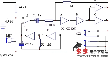 该机电原理如图。它由一个CMOS六反相器组成。A—D组成奇数级负反馈放大器。R1为反馈电阻,调节R2和R1的比值可调节电压增益,其典型增益可达100倍。F3和F4并联是为了增强放大器的负载能力。E和F构成一个低频信号发生器,它是一个最简单的CMOS多谐振荡器。它的振荡频率约为0.7Hz。改变C2或R3,可改变其振荡频率。R4和MIC构成拾音电路。