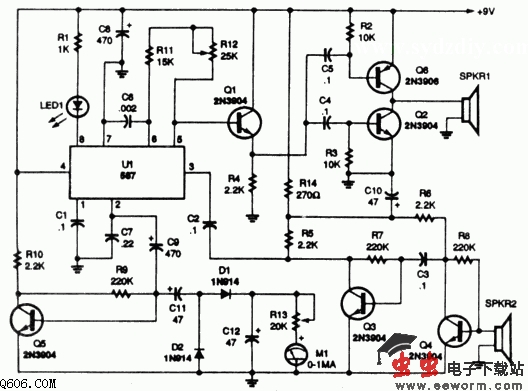 567的调频输出脚为第2脚,信号由此脚经电容C9送至超低频单晶体管放大级Q5的基极,放大后集电极经电阻R9送至倍压整流电路 Cll、D2、D1、C12和R13、M1,使FM信号变成模拟电压在M1上读出,M1为0—lmA模拟表。