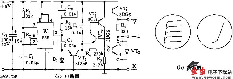 如图所示,555和R1、R2、C1组成无稳态多谐振荡器,振荡频率f=1.44(R1+2R2)C1.图示参数f=1100Hz。C2、R3组成积分电路,用以产生锯齿波,经VT4射随输出,加至示波器垂直“Y”输入及待测管的c极。C3、D1、VT1~VT3、C4等组成阶梯波产生器,每5个振荡周期,C4上的充电电压才使VT3导通,C4放电,形成5个阶梯。C4每充电一次,VT2射极电压降低一点,形成一个台阶。阶梯波通过R4加到待测管的b极上。待测管即为图中的VTx。接上示波器后观察到的I-V特性曲线如图b所示。
