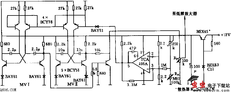 该电路可将热敏电阻的电阻值变化量变换为频率的变化量。基频信号(约1kHz)由一个低频多谐振荡器(5Hz)接通,两种频率都与温度有关。通过低频末级放大器可将此信号加至扬声器实现声音报警或提示。